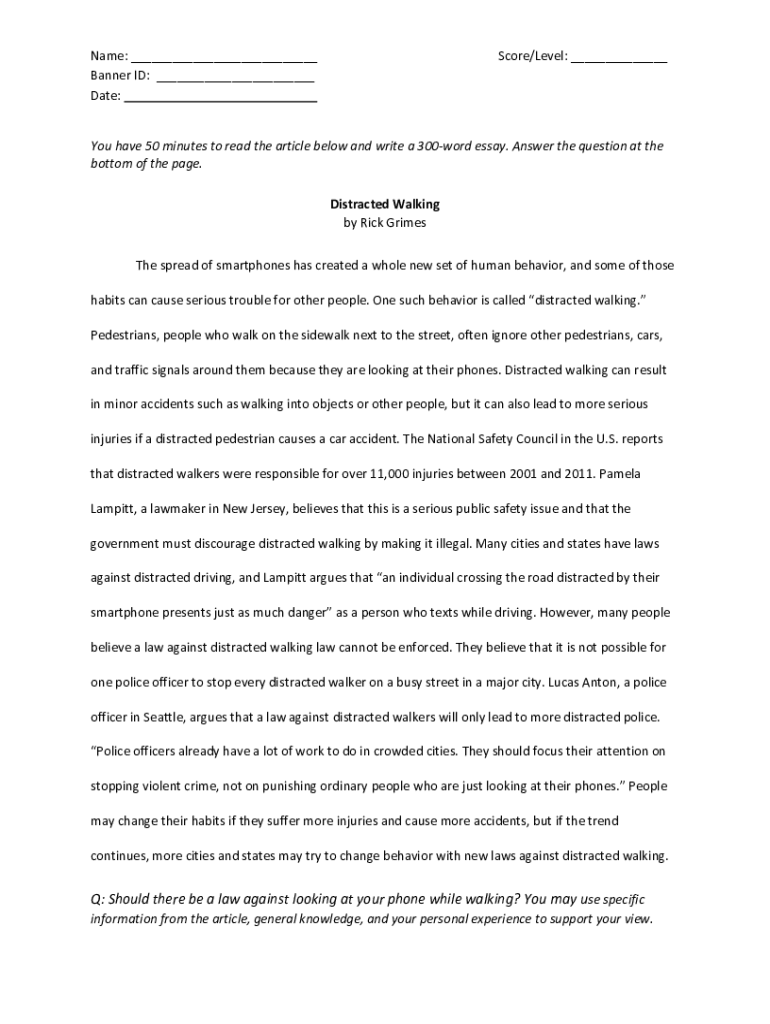 Name: ___ Banner ID: ___ Date:Score/Level: ___You have 50 minutes to read the article below and write a 300word essay. Answer the question at the bottom of the page. Distracted Walking by Rick Grimes