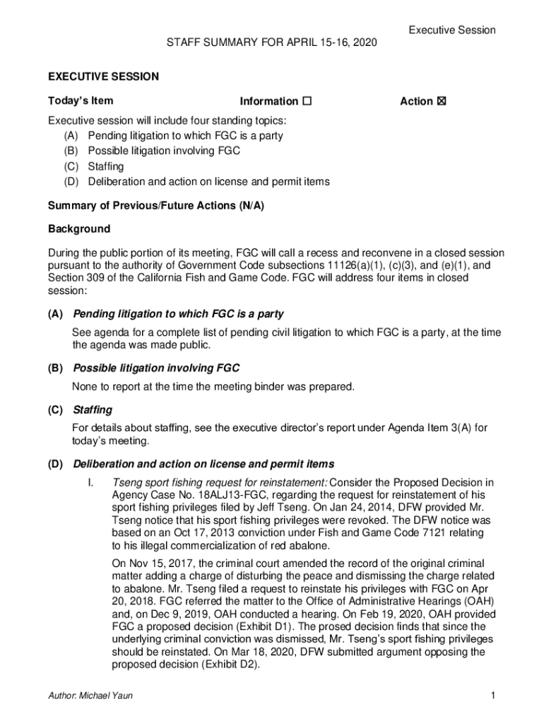 Executive Session STAFF SUMMARY FOR APRIL 1516, 2020 EXECUTIVE SESSION Today's ItemInformation Action Executive session will include four standing topics: (A) Pending litigation to which FGC is a