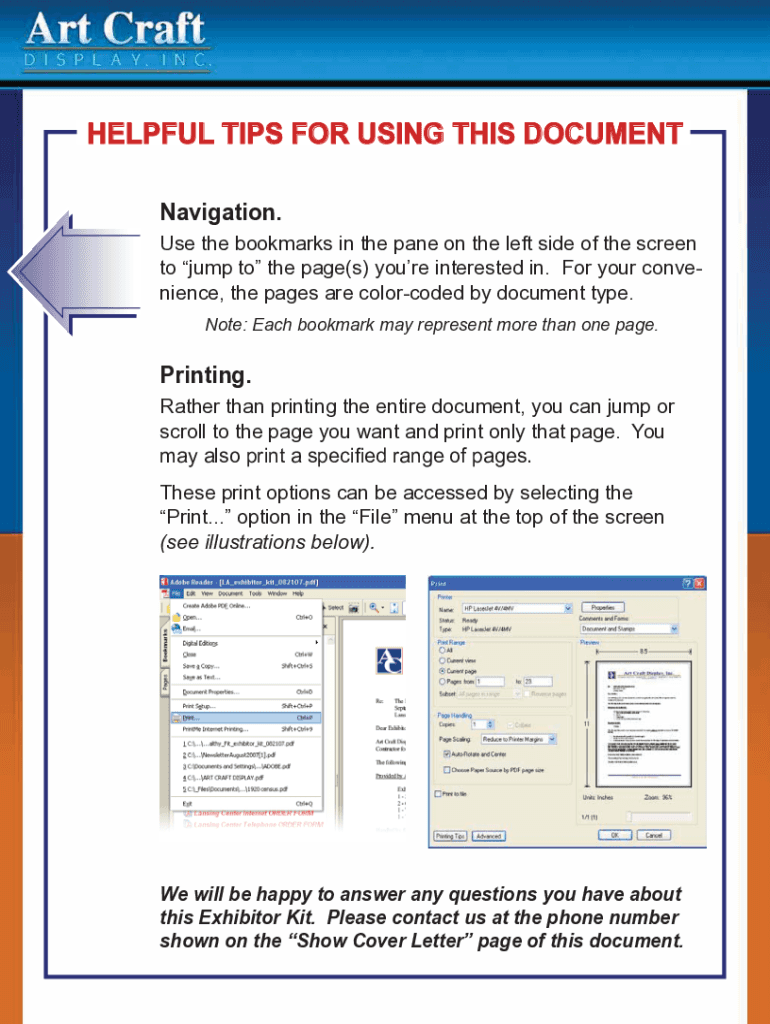 HELPFUL TIPS FOR USING THIS DOCUMENT Navigation. Use the bookmarks in the pane on the left side of the screen to jump to the page(s) you're interested in. For your convenience, the pages are color