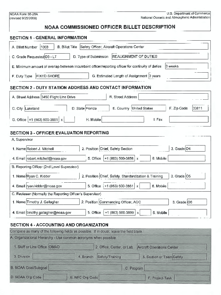 U.S. Department of Commerce National Oceanic and Atmospheric Administration NOAA Form 5628A (revised 9/25/2009)NOAA COMMISSIONED OFFICER BILLET DESCRIPTION SECTION 1 GENERAL INFORMATION A. Billet