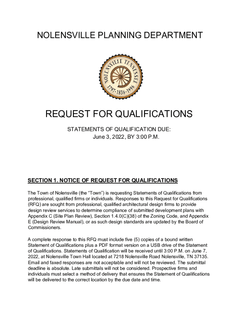 NOBLESVILLE PLANNING DEPARTMENTREQUEST FOR QUALIFICATIONS STATEMENTS OF QUALIFICATION DUE: June 3, 2022, BY 3:00 P.M.SECTION 1. NOTICE OF REQUEST FOR QUALIFICATIONS The Town of Noblesville (the Town)