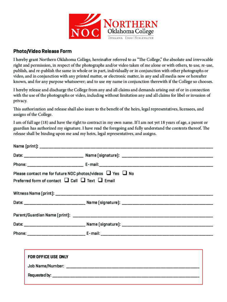 Photo/Video Release Form I hereby grant Northern Oklahoma College, hereinafter referred to as The College, the absolute and irrevocable right and permission, in respect of the photographs and/or video