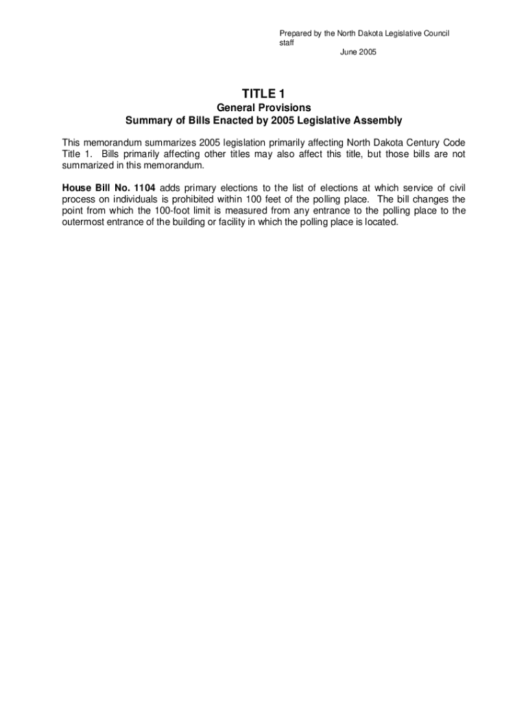 Prepared by the North Dakota Legislative Council staff June 2005TITLE 1 General Provisions Summary of Bills Enacted by 2005 Legislative Assembly This memorandum summarizes 2005 legislation primarily