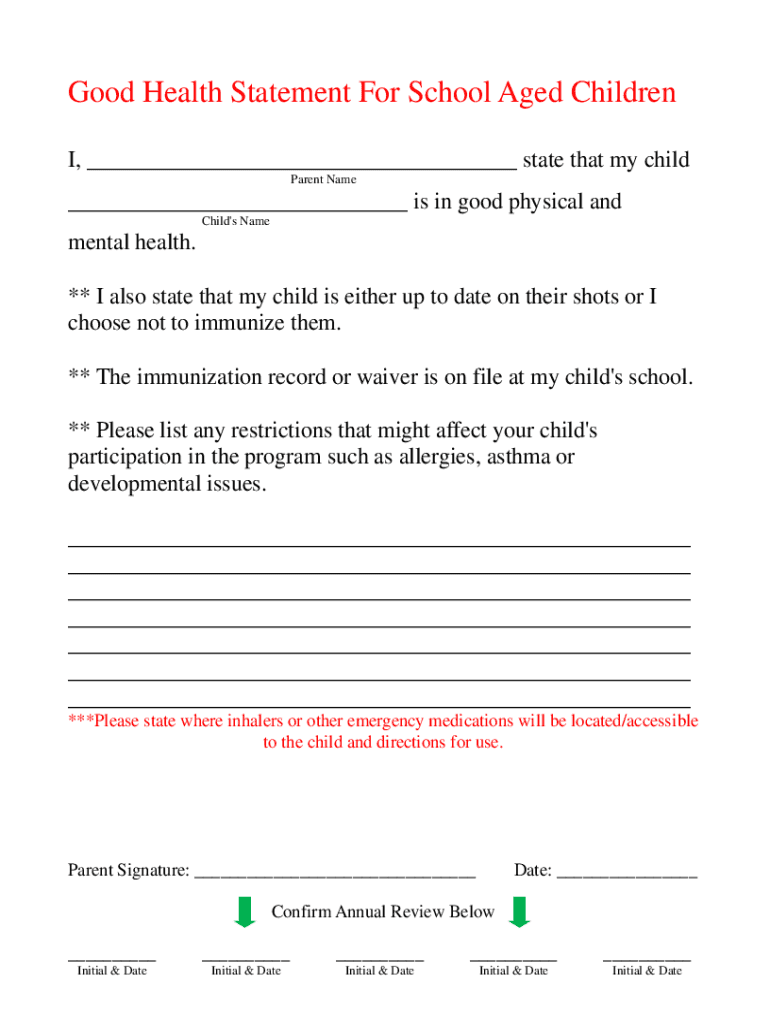 Good Health Statement For School Aged Children I, ___ state that my child Parent Name___ is in good physical and Child\'s Name mental health. ** I also state that my child is either up to date on