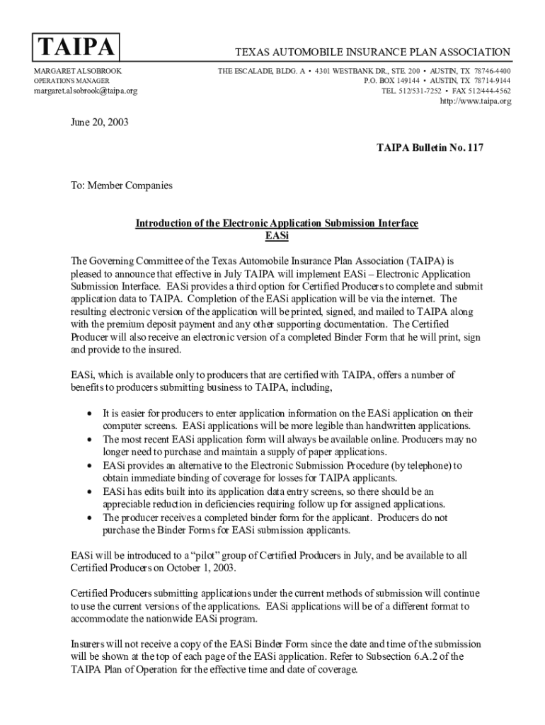 TAIPATEXAS AUTOMOBILE INSURANCE PLAN ASSOCIATIONMARGARET FALLBROOK OPERATIONS MANAGERmargaret. Also brook×Taipei.writhe ESCALADE, BLDG. A 4301 WETBACK DR., STE. 200 AUSTIN, TX 787464400 P.O. BOX