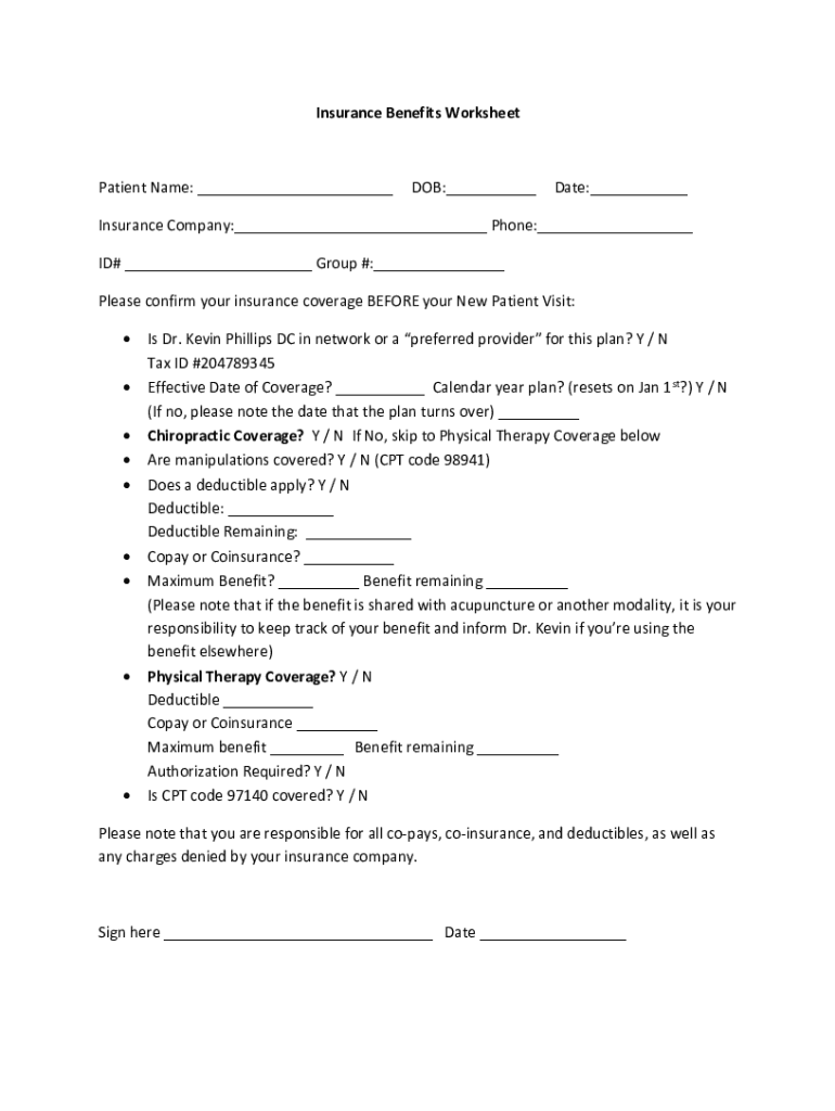 Insurance Benefits WorksheetPatient Name: ___DOB:___Date:___Insurance Company:___ Phone:___ ID# ___ Group #:___ Please confirm your insurance coverage BEFORE your New Patient Visit: Is Dr. Kevin Phillips