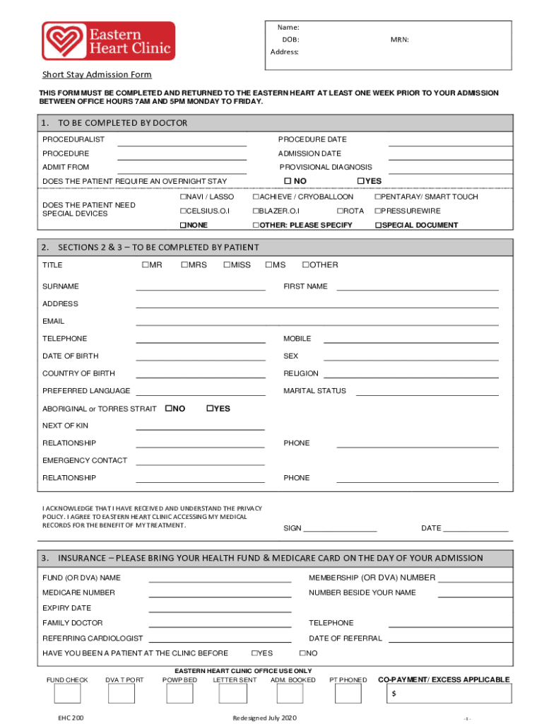 Name: DOB:MAN:Address:Short Stay Admission Form THIS FORM MUST BE COMPLETED AND RETURNED TO THE EASTERN HEART AT LEAST ONE WEEK PRIOR TO YOUR ADMISSION BETWEEN OFFICE HOURS 7AM AND 5PM MONDAY TO FRIDAY.1.