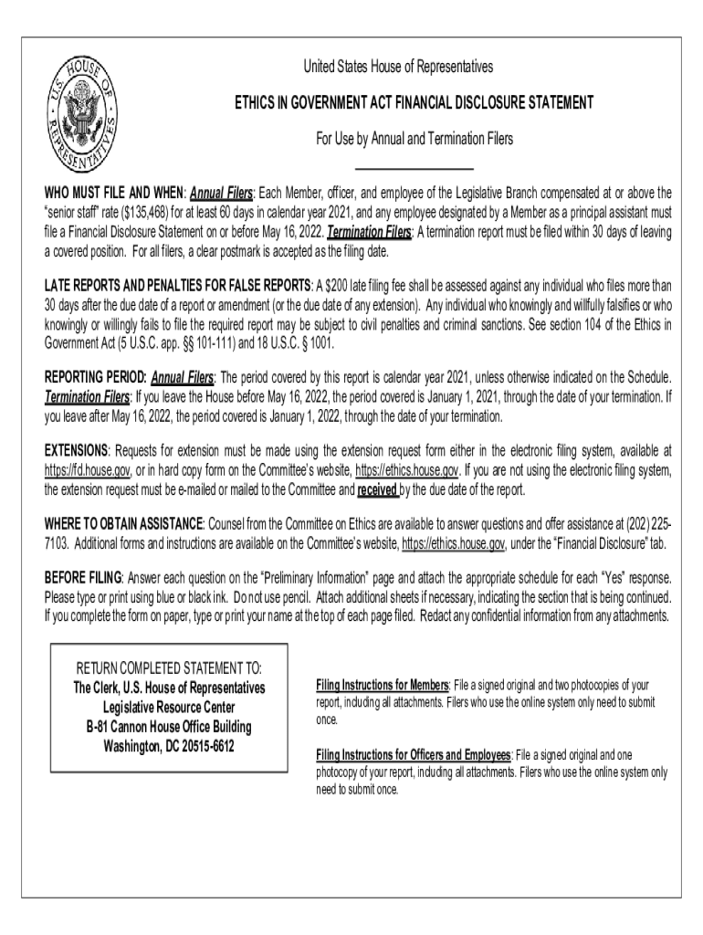 United States House of Representatives ETHICS IN GOVERNMENT ACT FINANCIAL DISCLOSURE STATEMENT For Use by Annual and Termination Filers WHO MUST FILE AND WHEN: Annual Filers: Each Member, officer,