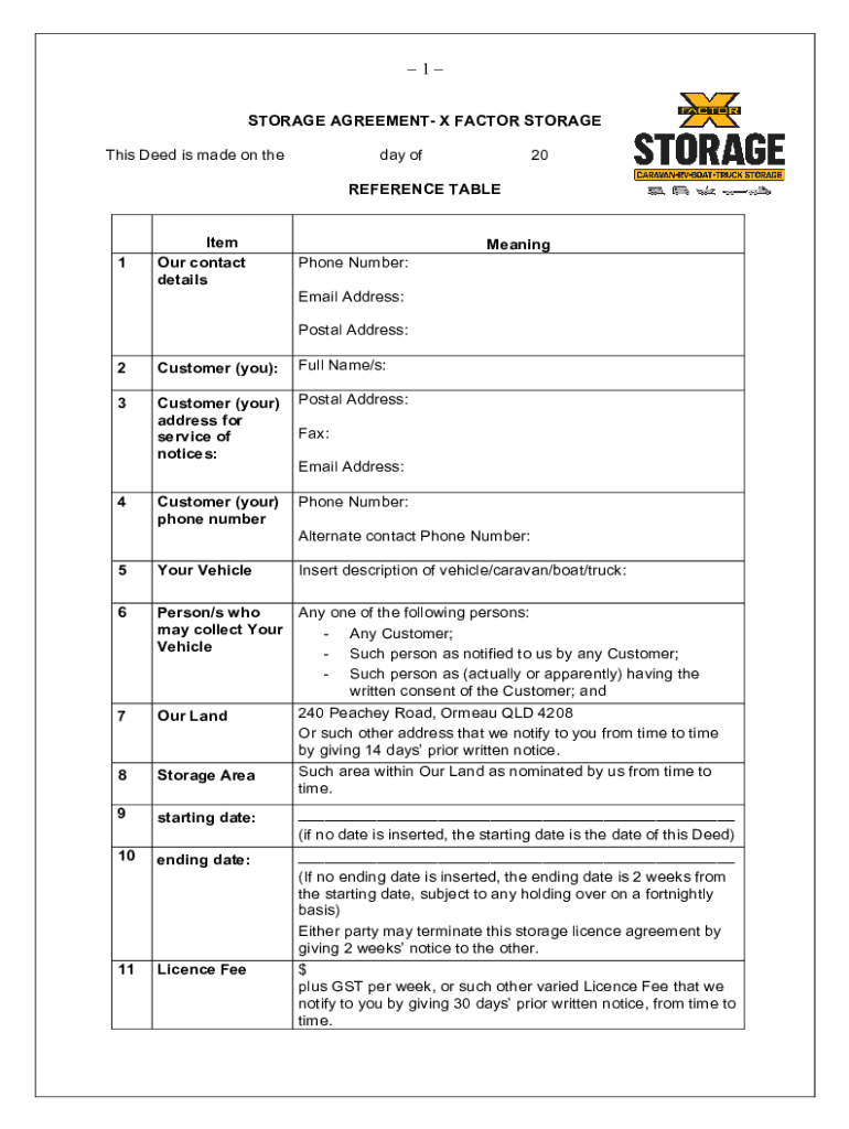 1STORAGE AGREEMENT X FACTOR STORAGE This Deed is made on the day of20REFERENCE TABLE1Item Our contact detailsMeaning Phone Number: Email Address: Postal Address:2Customer (you):Full Name/s:3Customer