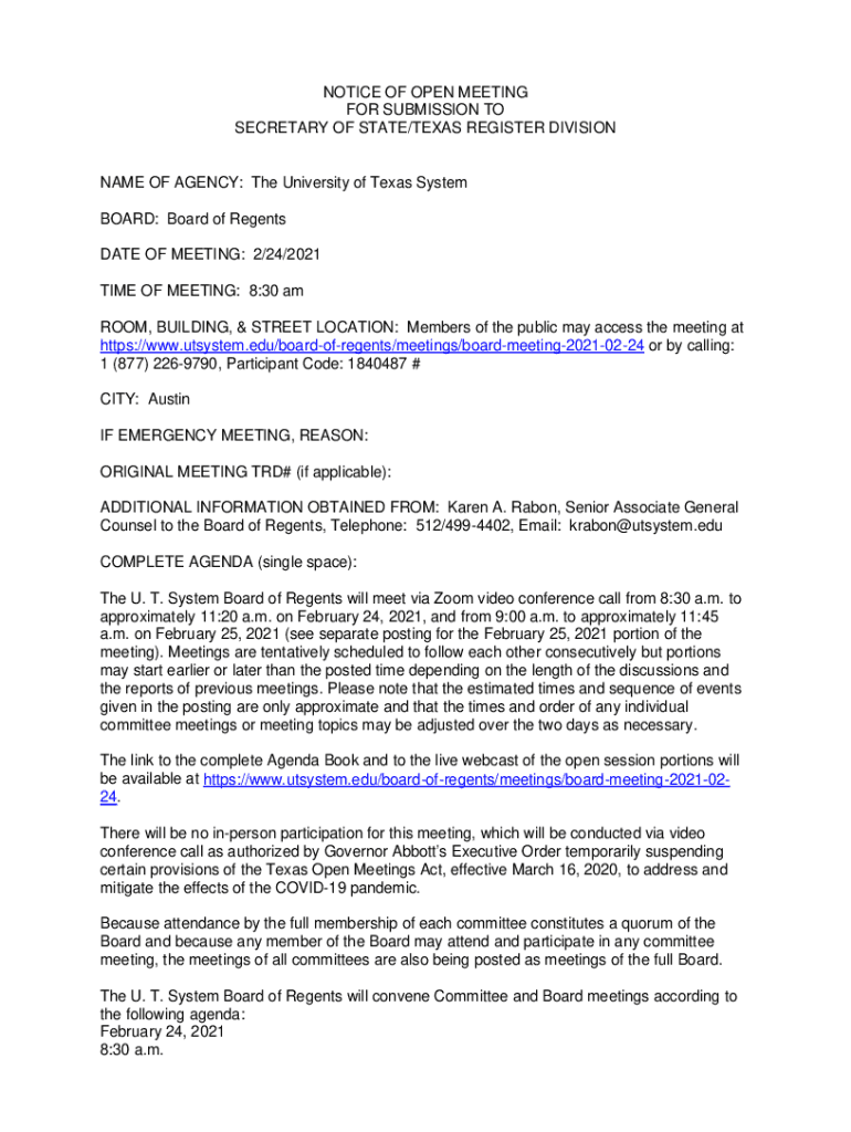 NOTICE OF OPEN MEETING FOR SUBMISSION TO SECRETARY OF STATE/TEXAS REGISTER DIVISIONAL OF AGENCY: The University of Texas System BOARD: Board of Regents DATE OF MEETING: 2/24/2021 TIME OF MEETING: