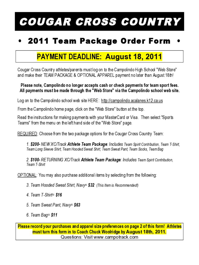 COUGAR CROSS-COUNTRY 2011 Team Package Order Form PAYMENT DEADLINE: August 18, 2011, Cougar Cross Country athletes/parents must log on to the Campolindo High School \” Web Store\” and make their