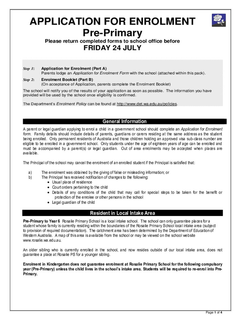 APPLICATION FOR Enrollment PrePrimary Please return completed forms to school office beforeFRIDAY 24 JULY Step 1:Application for Enrollment (Part A) Parents lodge an Application for Enrollment Form