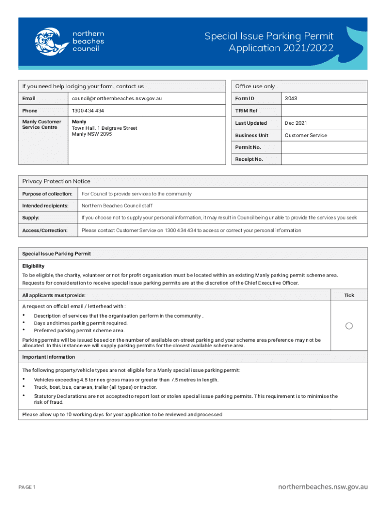 Special Issue Parking Permit Application 2021/2022If you need help lodging your form, contact office use onlyEmailcouncil×northern beaches.NSW.gov.form IDPhone1300 434 434TRIM Germany Customer Service
