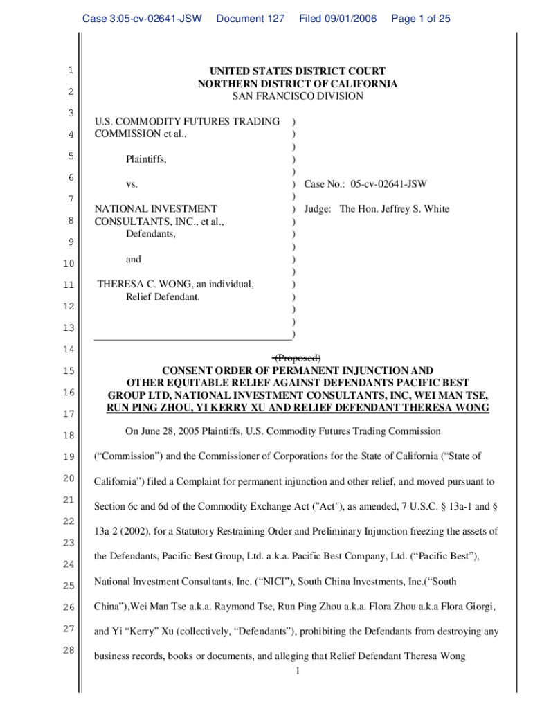 Case 3:05cv02641JSW14 5 6U. S. COMMODITY FUTURES TRADING COMMISSION et al., Plaintiffs, vs.7 8 9 10 11 12 13 14 15 16 17 18Filed 09/01/2006Page 1 of 25UNITED STATES DISTRICT COURT NORTHERN DISTRICT