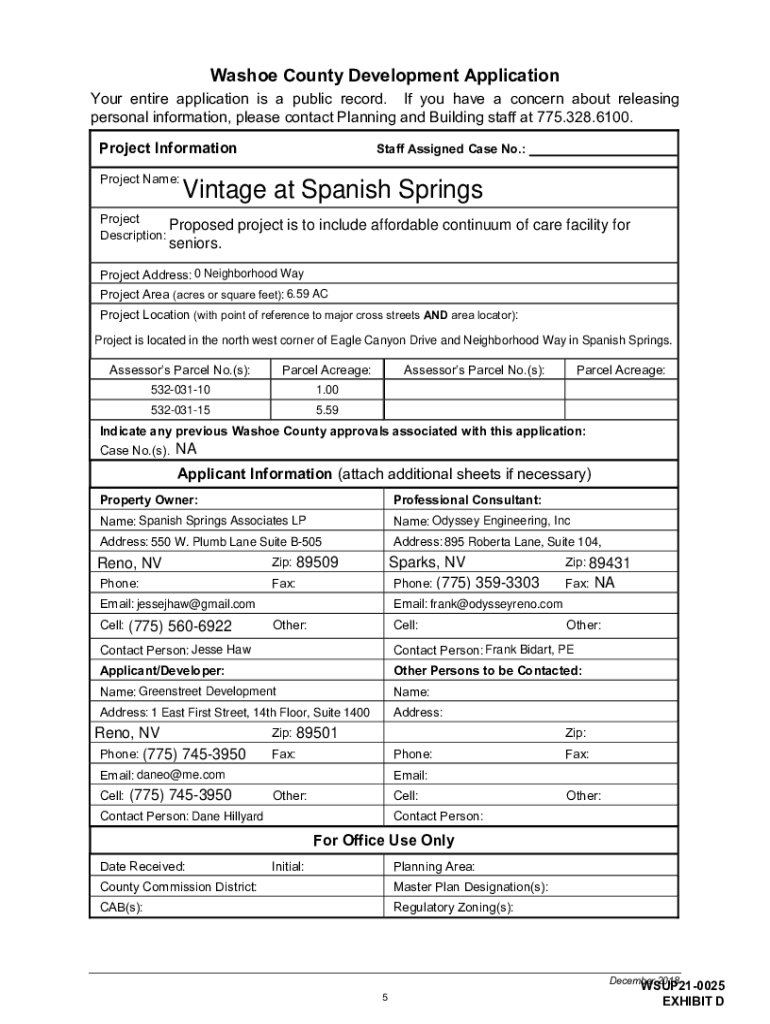 Information such as project plans, site location, intended land use, building specifications, environmental impact assessments, and proposed timelines must be reported on the Washoe County CSD Planning and Development Board forms.