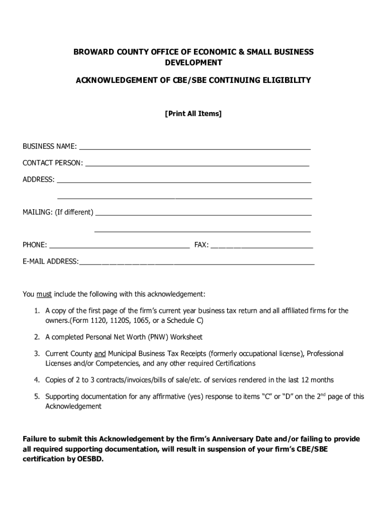 BROWARD COUNTY OFFICE OF ECONOMIC & SMALL BUSINESS DEVELOPMENT ACKNOWLEDGEMENT OF CBE/BE CONTINUING ELIGIBILITY×Print All Items×BUSINESS NAME: ___ CONTACT PERSON: ___ ADDRESS: ___ ___ MAILING: (If