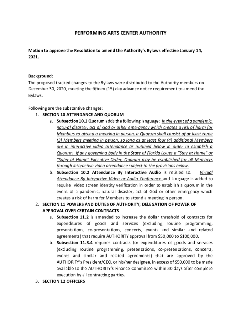 PERFORMING ARTS CENTER AUTHORITY Motion to approve the Resolution to amend the Authorities Bylaws effective January 14, 2021. Background: The proposed tracked changes to the Bylaws were distributed