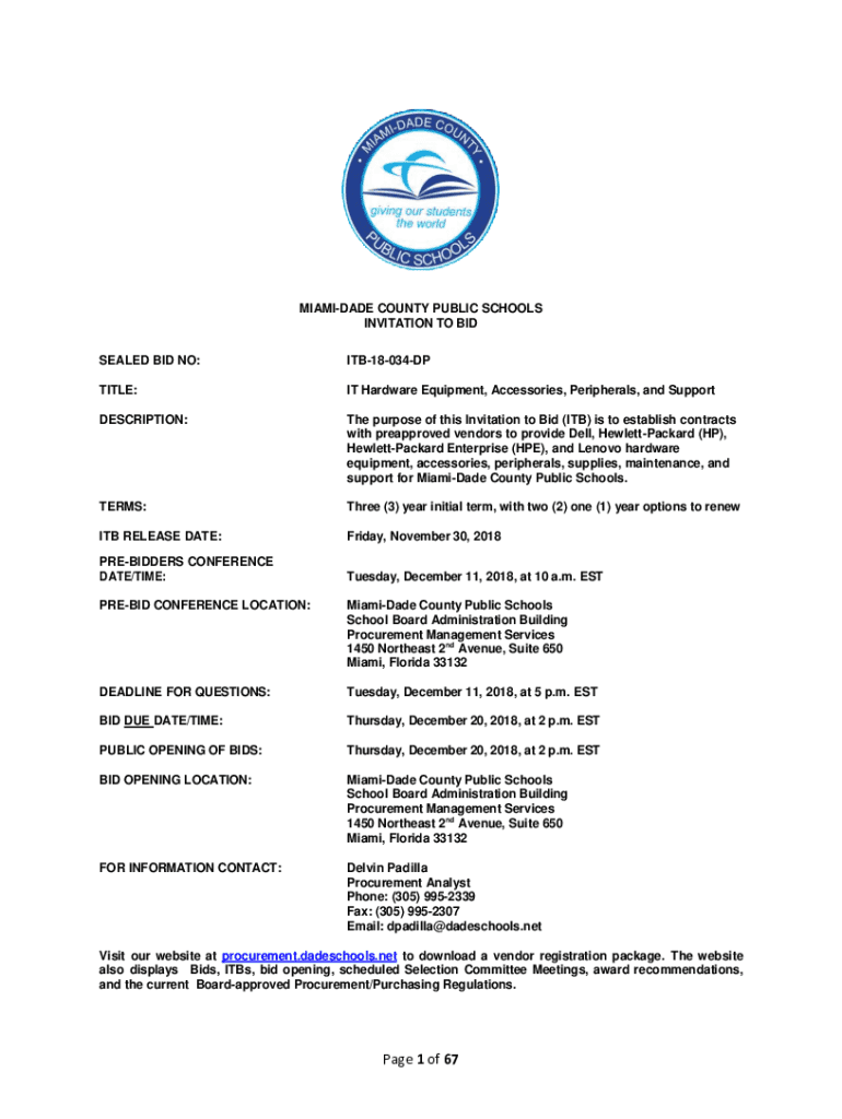 MIA MIDADE COUNTY PUBLIC SCHOOLS INVITATION TO BID SEALED BID NO:ITB18034DPTITLE:IT Hardware Equipment, Accessories, Peripherals, and SupportDESCRIPTION:The purpose of this Invitation to Bid (ITB)