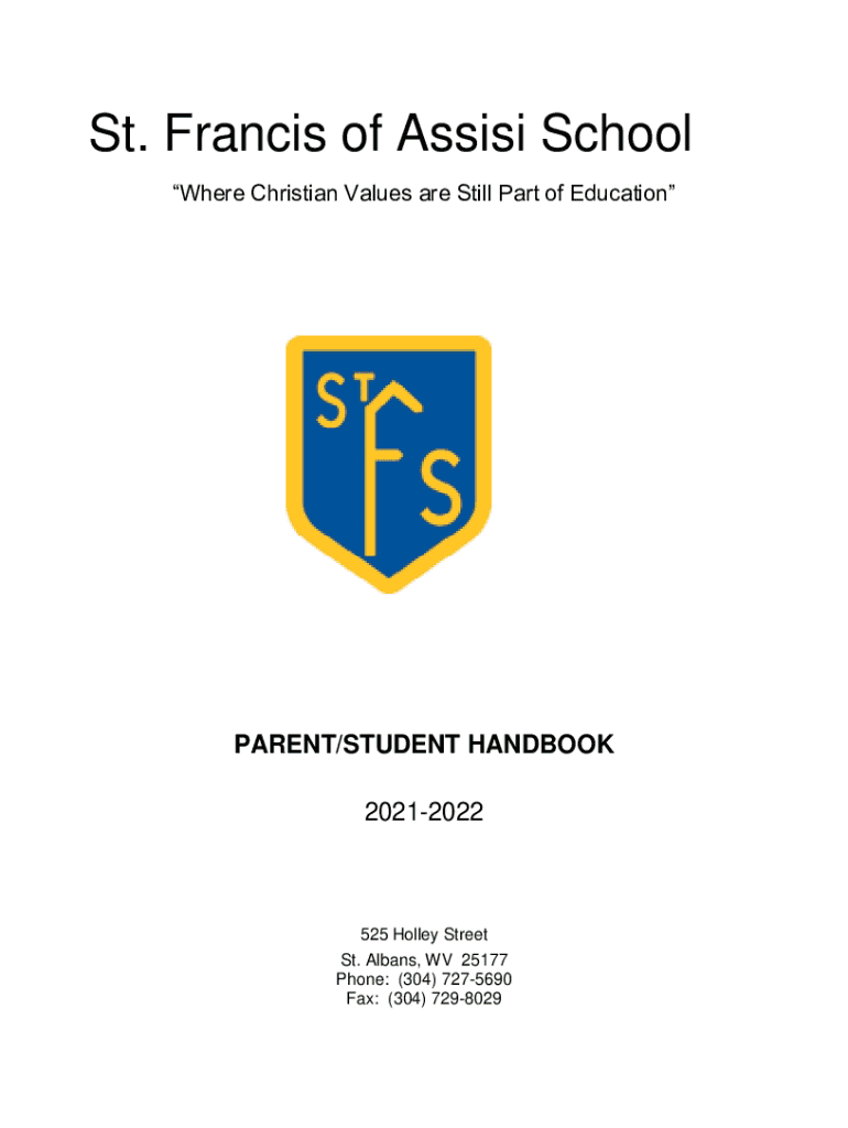 St. Francis of Assisi School Where Christian Values are Still Part of EducationPARENT/STUDENT HANDBOOK 20212022525 Holley Street St. Albany, WV 25177 Phone: (304) 7275690 Fax: (304) 7298029www.SSW.complaint