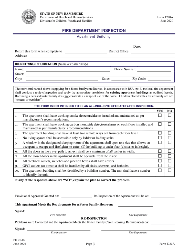 STATE OF NEW HAMPSHIRE Department of Health and Human Services Division for Children, Youth and FamiliesForm 1720A June 2020FIRE DEPARTMENT INSPECTION Apartment Building Date: Return this form when