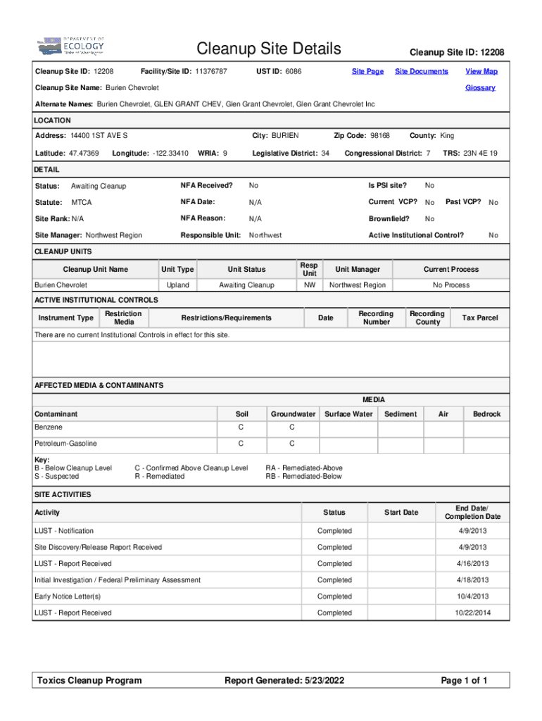 Cleanup Site Details Cleanup Site ID: 12208Facility/Site ID: 11376787Cleanup Site ID: 12208UST ID: 6086Site Page Site Documentaries Cleanup Site Name: Buried ChevroletGlossaryAlternate Names: Buried