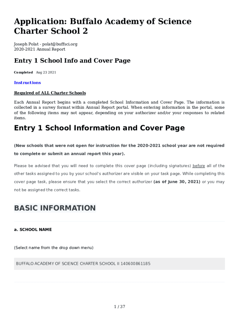 Application: Buffalo Academy of Science Charter School 2 Joseph Polar polat@buffsci.org 20202021 Annual Reportedly 1 School Info and Cover Page Completed Aug 23 2021Instructions Required of ALL Charter