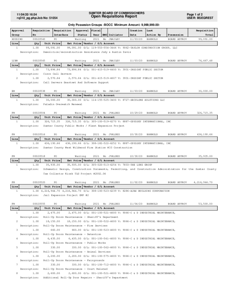 SUMTER BOARD OF COMMISSIONERS11/04/20 16:54 rq310_pg.php/Job No: 51054Page 1 of 2 USER: BSEGRESTOpen Requisitions Report Only Possession Groups :BOCK Minimum Amount: 9,999,999.00ApprovalRequisitionRequisitionGroupNoInterfaceHOUSING00020540POLineQtyUnit