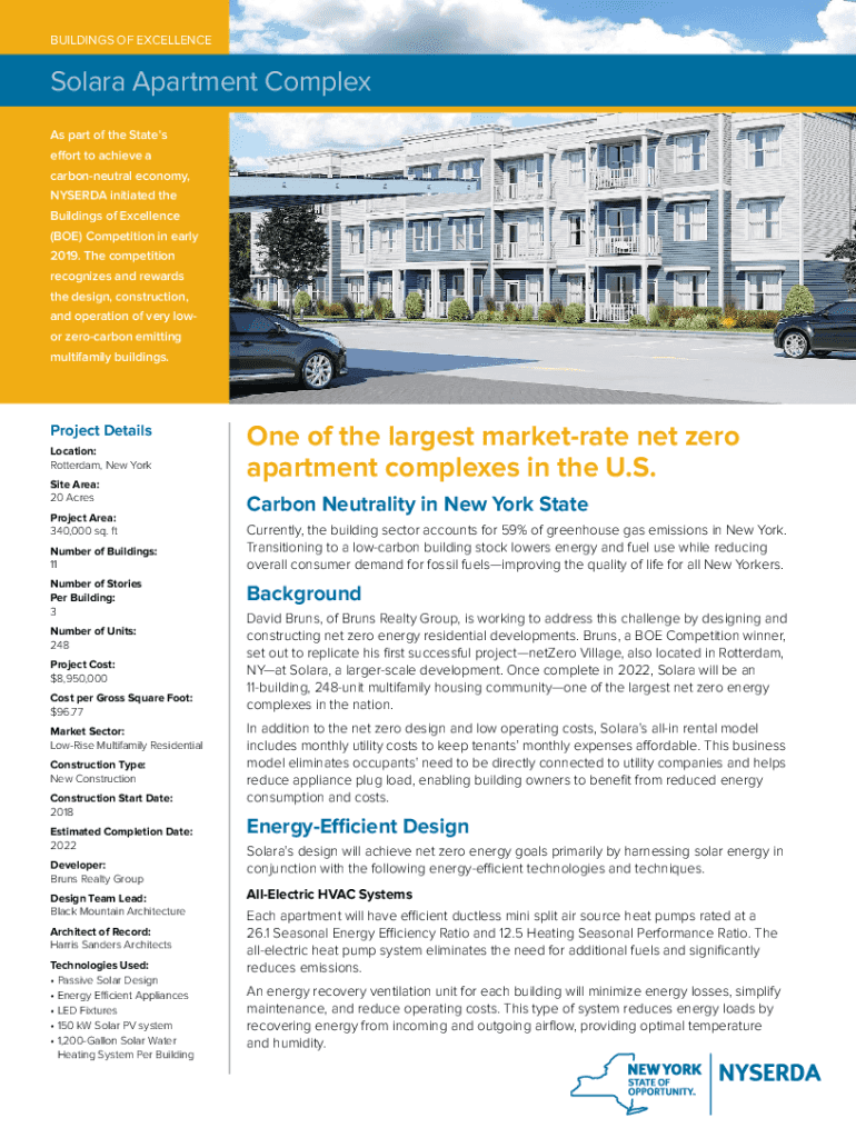 BUILDINGS OF EXCELLENCESolara Apartment Complex As part of the States effort to achieve a carbon-neutral economy, NYSE RDA initiated the Buildings of Excellence (BOE) Competition in early 2019. The