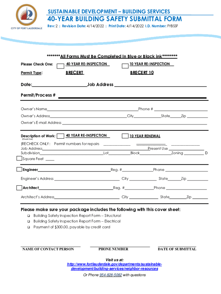 SUSTAINABLE DEVELOPMENT BUILDING SERVICES40YEAR BUILDING SAFETY SUBMITTAL FORM Rev: 2 | Revision Date: 4/14/2022 | Print Date: 4/14/2022 I.D. Number: FBS*******All Forms Must Be Completed In Blue