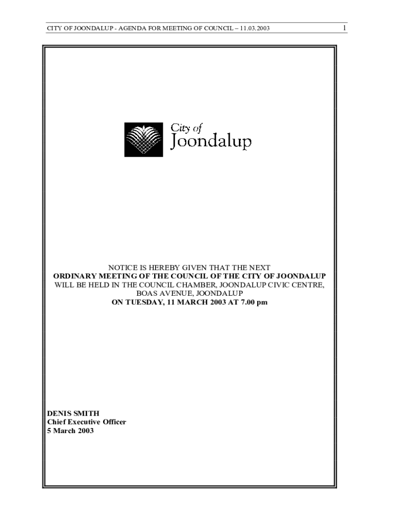 CITY OF JOONDALUP AGENDA FOR MEETING OF COUNCIL 11.03.2003NOTICE IS HEREBY GIVEN THAT THE NEXT ORDINARY MEETING OF THE COUNCIL OF THE CITY OF JOONDALUP WILL BE HELD IN THE COUNCIL CHAMBER, JOONDALUP