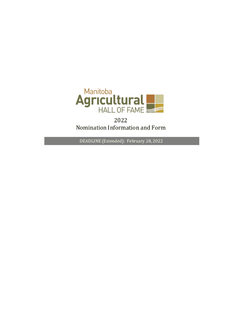 2022Nomination Information and FormDEADLINE (Extended):February 28, 2022Mission Statement recognize and honor innovators, leaders and visionaries for their contribution to agriculture in Manitoba.
