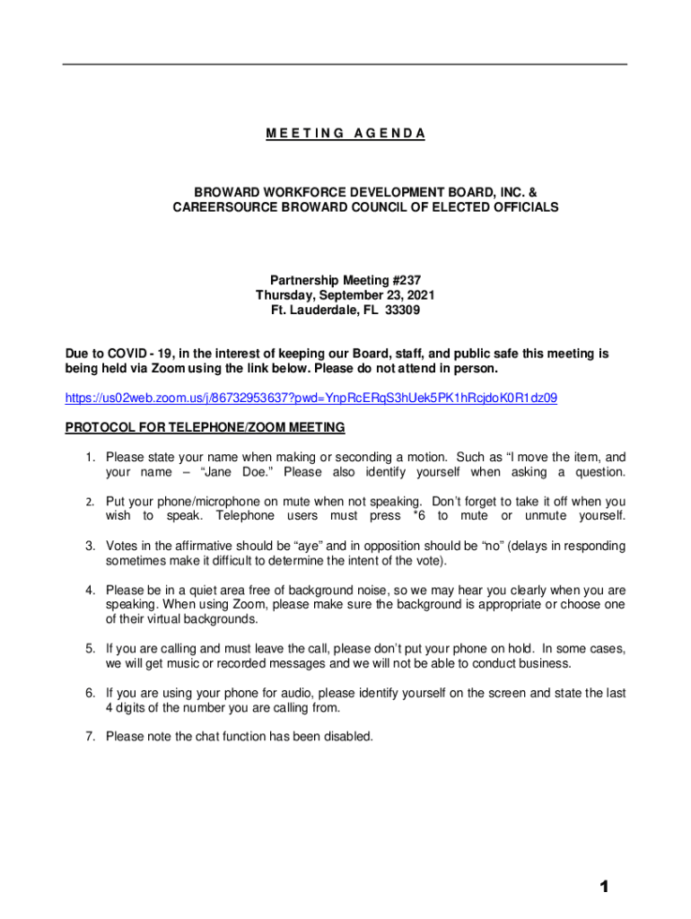 MEETING AGENDABROWARD WORKFORCE DEVELOPMENT BOARD, INC. & CAREERSOURCE BROWARD COUNCIL OF ELECTED OFFICIALSPartnership Meeting #237 Thursday, September 23, 2021, Ft. Lauderdale, FL 33309Due to COVID-19,