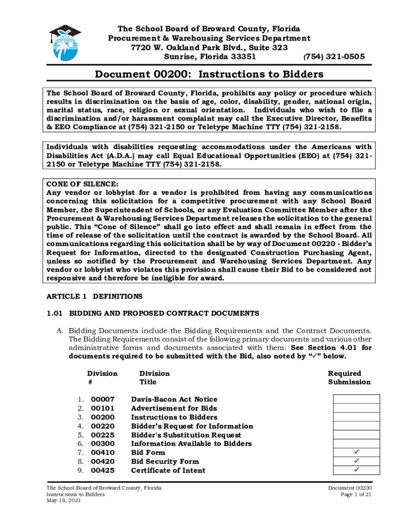The School Board of Broward County, Florida Procurement & Warehousing Services Department 7720 W. Oakland Park Blvd., Suite 323 Sunrise, Florida 33351 (754) 3210505Document 00200: Instructions to