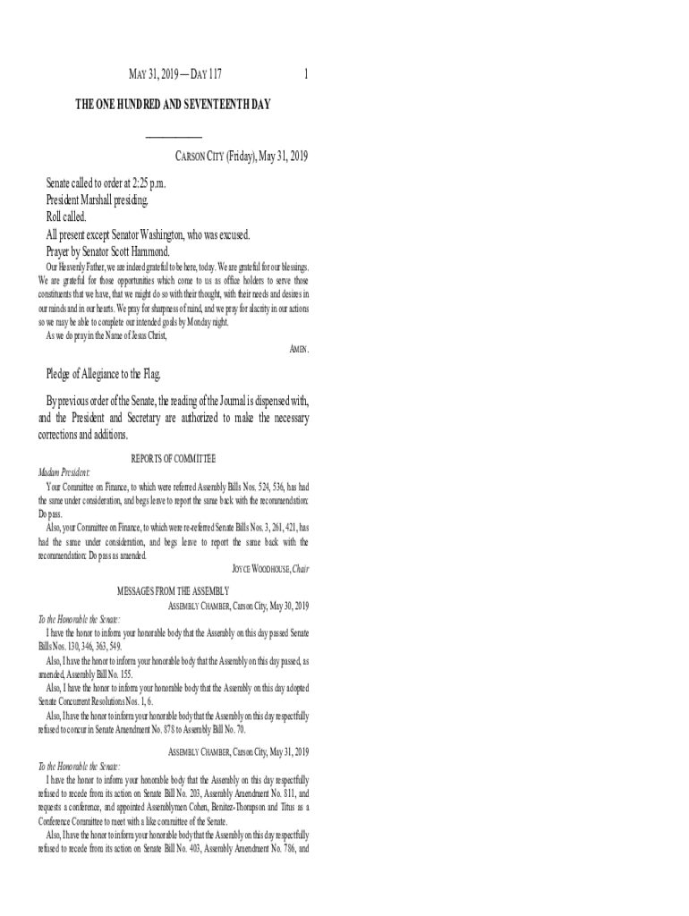MAY 31, 2019, DAY 1171THE ONE HUNDRED AND SEVENTEENTH DAY ___ CARSON CITY (Friday), May 31, 2019, Senate called to order at 2:25 p.m. President Marshall presiding. Roll called. All present except