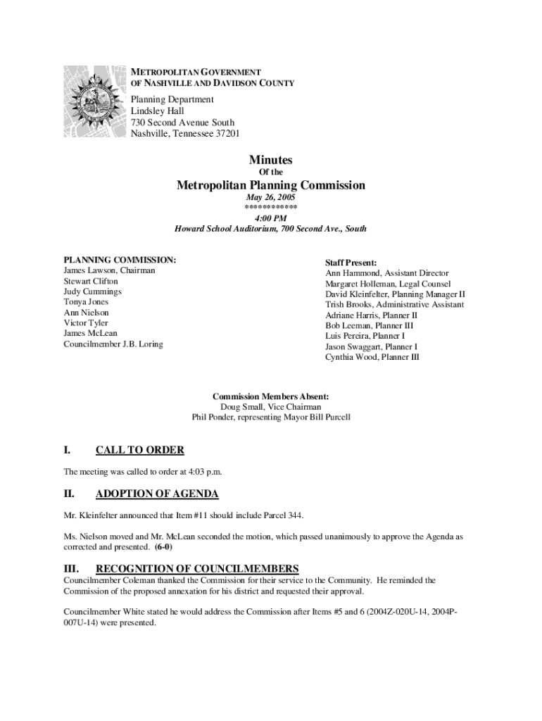 METROPOLITAN GOVERNMENT OF NASHVILLE AND DAVIDSON COUNTY Planning Department Lindsey Hall 730 Second Avenue South Nashville, Tennessee 37201Minutes Of metropolitan Planning Commission May 26, 2005
