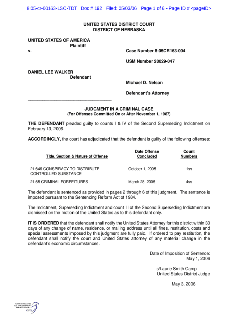 8:05cr00163LSCTDT Doc # 192 Filed: 05/03/06-Page 1 of 6-Page ID # paged UNITED STATES DISTRICT COURT DISTRICT OF NEBRASKA UNITED STATES OF AMERICA Plaintiff v. Case Number 8:05CR163004 US Number 20029047DANIEL