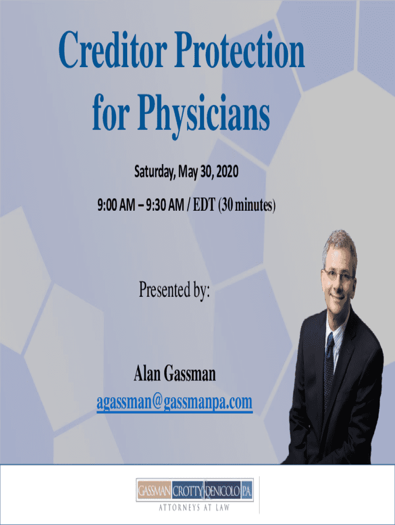 Creditor Protection for Physicians Saturday, May 30, 20209:00 AM 9:30 AM / EDT (30 minutes)Presented by:Alan Gasman agassman@gassmanpa.com1UPCOMING FREE WEBINARS FROM OUR FIRM Thursday, June 4, 2020,