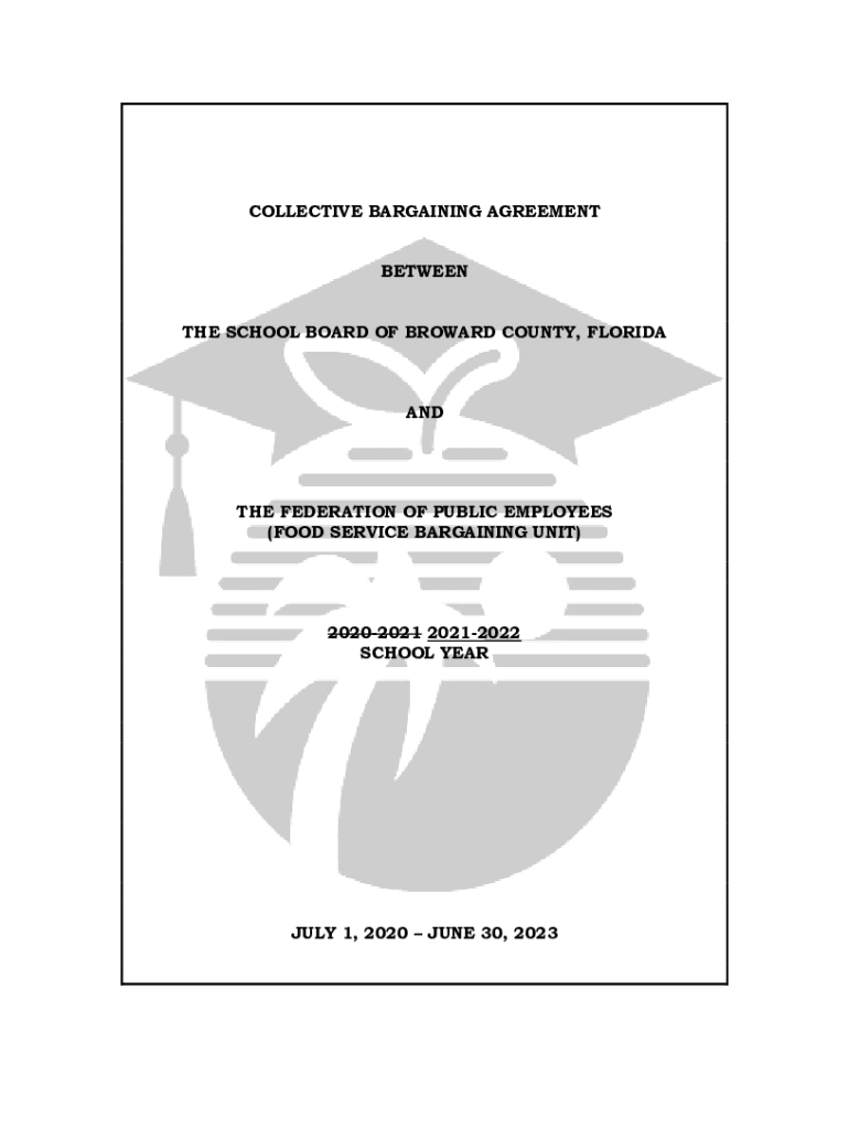 COLLECTIVE BARGAINING AGREEMENT BETWEEN THE SCHOOL BOARD OF BROWARD COUNTY, FLORIDAANDTHE FEDERATION OF PUBLIC EMPLOYEES (FOOD SERVICE BARGAINING UNIT)20202021 20212022 SCHOOL YEARLY 1, 2020 JUNE