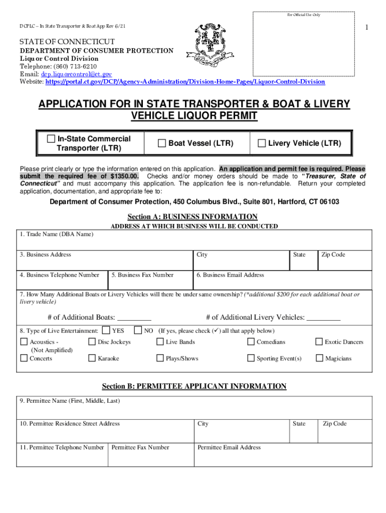 For Official Use Only1DCPLC In State Transporter & Boat App Rev 6/21STATE OF CONNECTICUTDEPARTMENT OF CONSUMER PROTECTION Liquor Control Division Telephone: (860) 7136210 Email: dcp.liquorcontrol@ct.gov