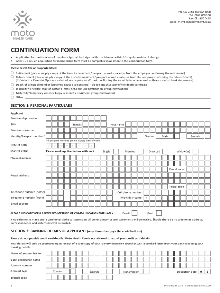 PO Box 2338, Durban 4000 Tel: 0861 000 300 Fax: 031 580 0478 Email: membership@mhcmf.co.zaCONTINUATION FORM Application for continuation of membership shall be lodged with the Scheme within 30 days
