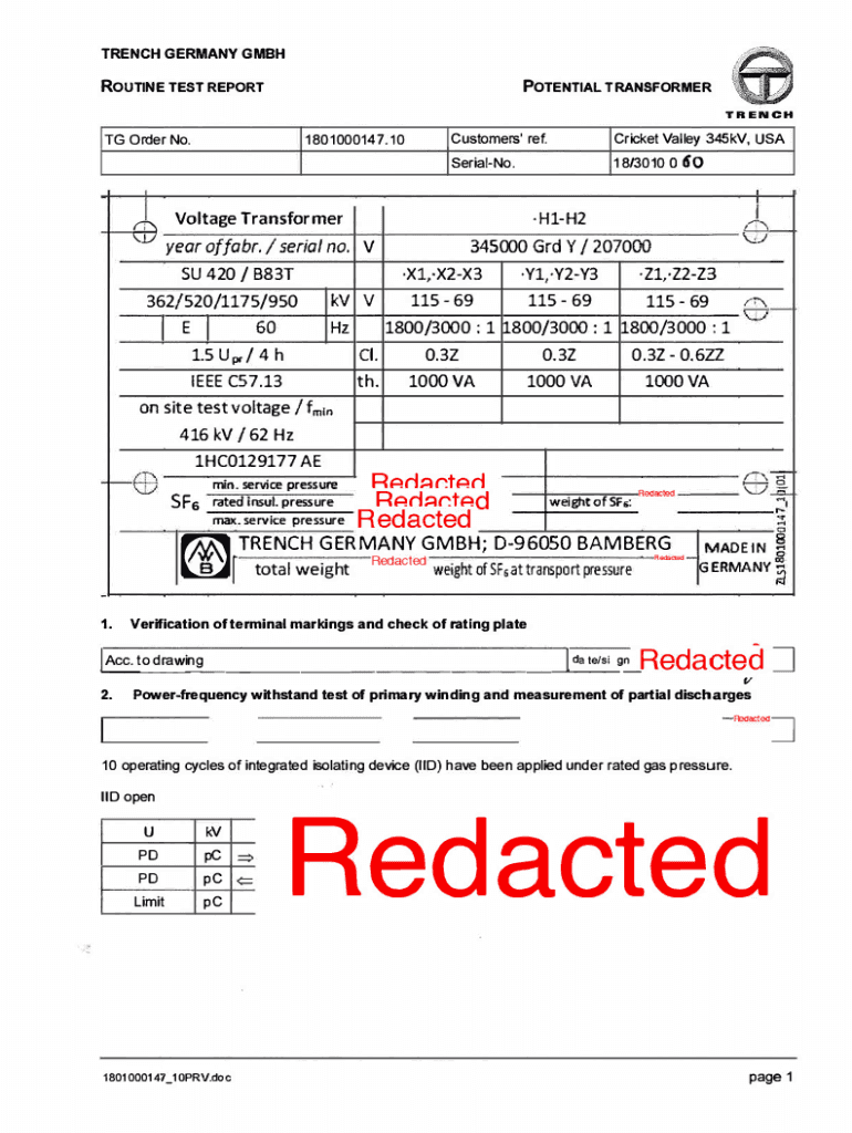 TRENCH GERMANY GmbH ROUTINE TEST REPORT Cordero.;POTENTIAL TRANSFORMER 1801000147.10IISFsCricket Valley345kV, USA18/3010 O 60SerialNo. H1H2345000 GRD Y / 207000 Z1,Z2Z3 XL,X2×3 YL Y2Y3 KV V 11569