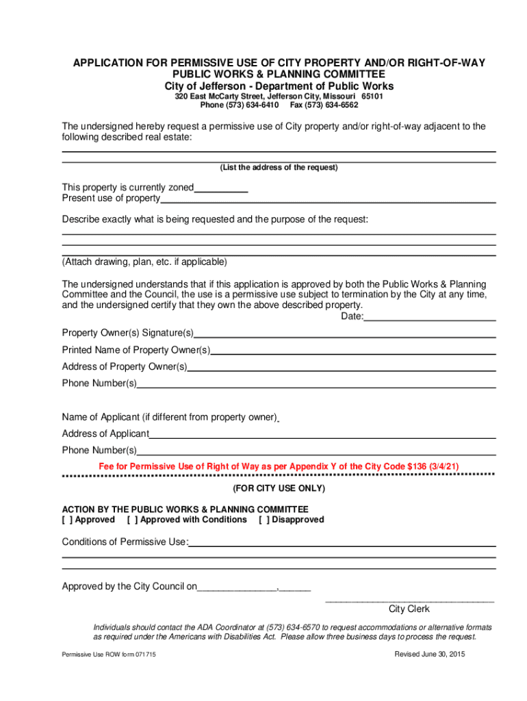 APPLICATION FOR PERMISSIVE USE OF CITY PROPERTY AND/OR RIGHTOFWAY PUBLIC WORKS & PLANNING COMMITTEE City of Jefferson Department of Public Works 320 East McCarty Street, Jefferson City, Missouri 65101