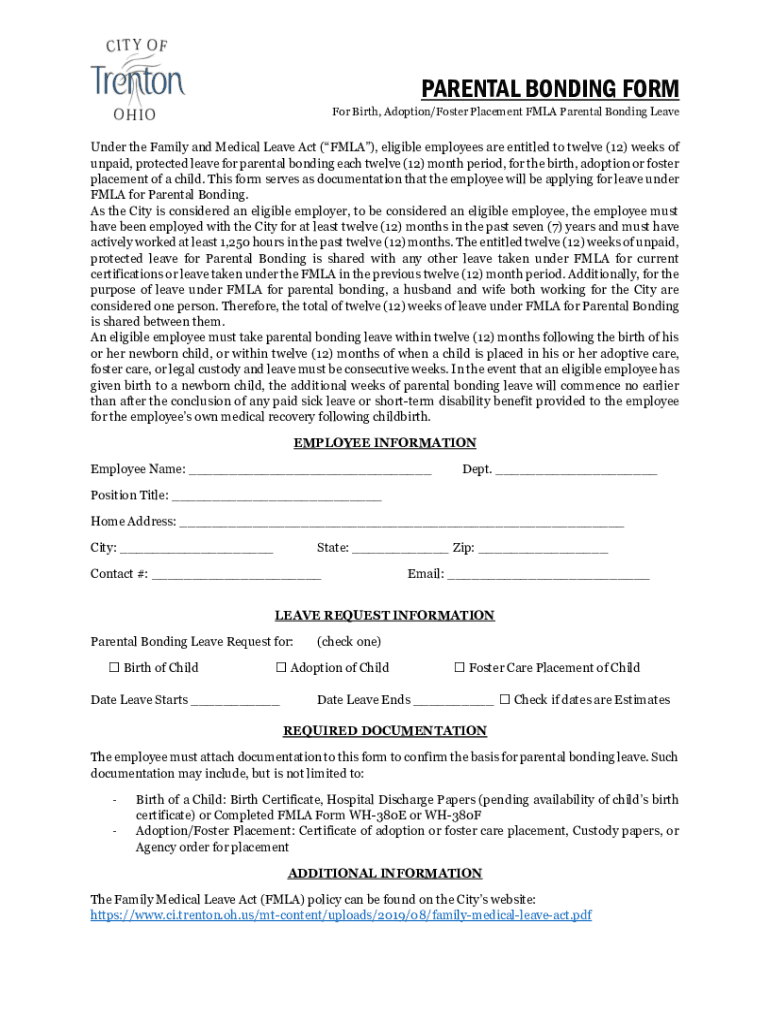 Get the free PARENTAL BONDING FORM - cityoftrenton.com