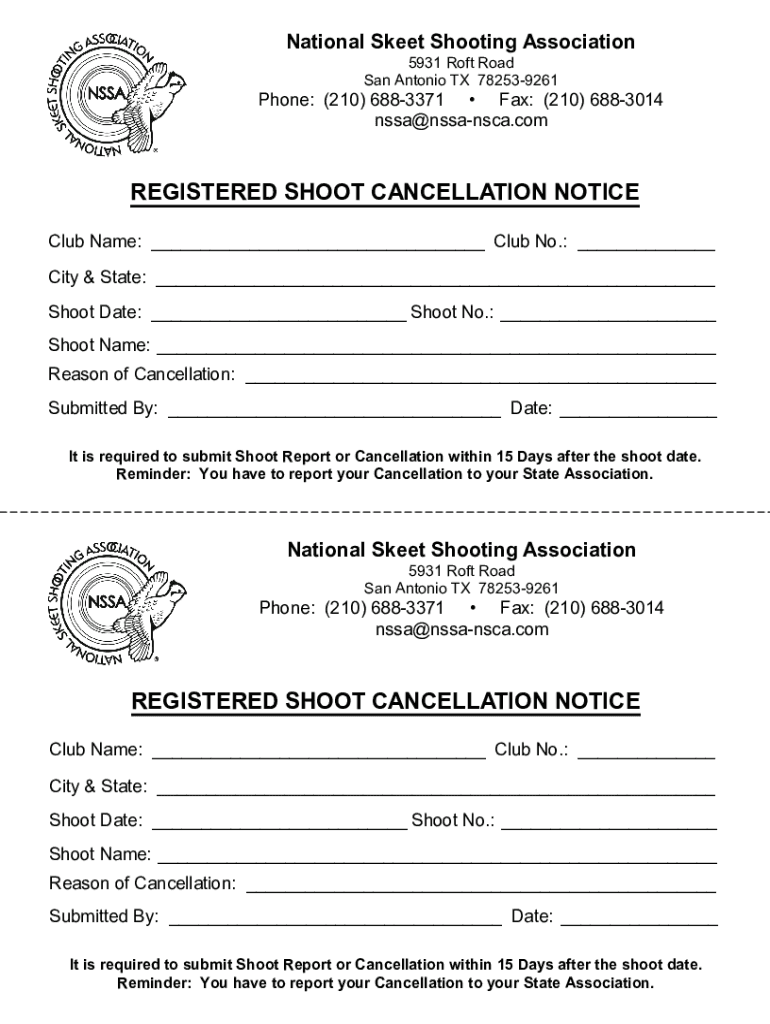 National Skeet Shooting Association 5931 Root Road San Antonio TX 782539261Phone: (210) 6883371 Fax: (210) 6883014 nssa@nssansca.comREGISTERED SHOOT CANCELLATION NOTICE Club Name: ___ Club No.: ___