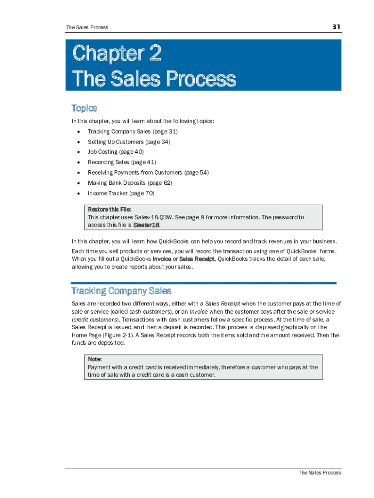 The Sales ProcessChapter 2 The Sales Process Topics In this chapter, you will learn about the following topics: Tracking Company Sales (page 31)Setting Up Customers (page 34)Job Costing (page 40)Recording