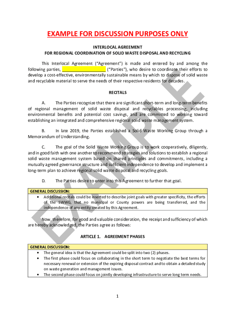 EXAMPLE FOR DISCUSSION PURPOSES ONLY INTERLOCK AGREEMENT FOR REGIONAL COORDINATION OF SOLID WASTE DISPOSAL AND RECYCLING This Interlocal Agreement (Agreement) is made and entered by and among the