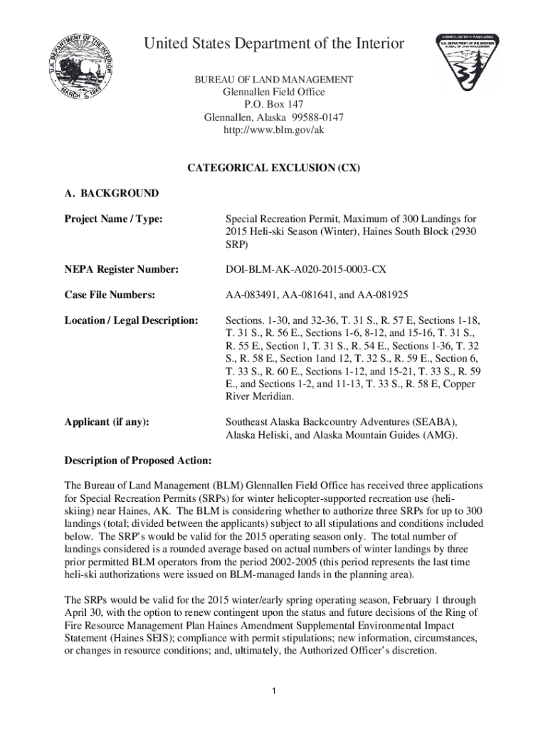 United States Department of the Interior BUREAU OF LAND MANAGEMENTGlennallen Field Office. O. Box 147Glennallen, Alaska 995880147http://www.blm.gov/akCATEGORICAL EXCLUSION (CX) A. BACKGROUND Project