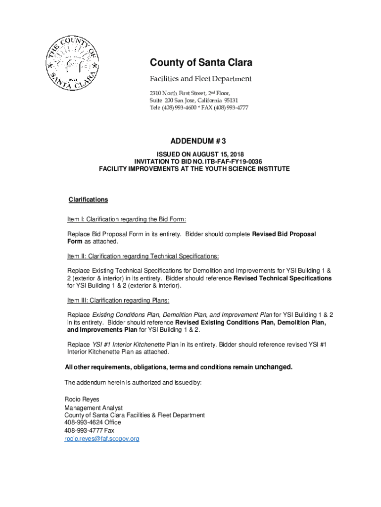 County of Santa Clara Facilities and Fleet Department 2310 North First Street, 2nd Floor, Suite 200 San Jose, California 95131 Tell (408) 9934600 * FAX (408) 9934777ADDENDUM # 3 ISSUED ON AUGUST 15,