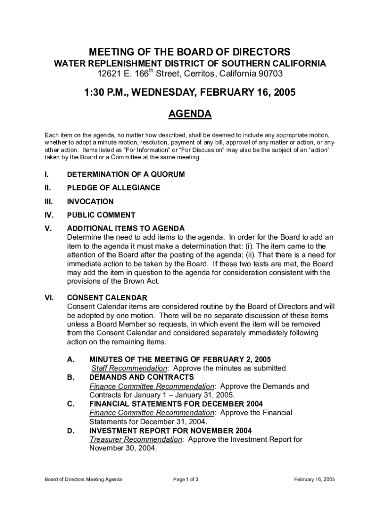 MEETING OF THE BOARD OF DIRECTORS Waters REPLENISHMENT DISTRICT OF SOUTHERN CALIFORNIA 12621 E. 166th Street, Burritos, California 907031:30 P.M., WEDNESDAY, FEBRUARY 16, 2005, AGENDA Each item on