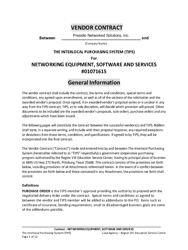 VENDOR CONTRACT BetweenPresidio Networked Solutions, Inc.___ and (Company Name)THE INTERLOCK PURCHASING SYSTEM (TIPS) Networking EQUIPMENT, SOFTWARE AND SERVICES #01071615General Information The vendor